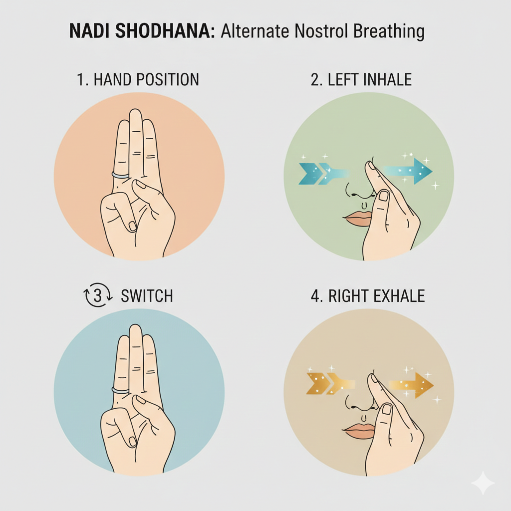 This technique balances left and right brain hemispheres. Close your right nostril, inhale through left. Close left nostril, exhale through right. Reverse.